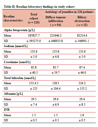 A total of 676 HCC patients were treated at Groote Schuur Hospital during the inclusion period. One hundred and twenty-six (18.6%) patients were jaundiced at the time of diagnosis (Figure 1). Baseline characteristics of these patients are summarized in Tables I and II. Eighty-nine (70.6%) patients were male, and the mean age was 48.8 years. Pain and weight loss were the most frequently associated symptoms in 72.9% and 60.5% of patients respectively. The mean duration of symptoms was 75.4 days. Seventy-three (57.9%) patients tested positive for HBV and five (3.9%) were HCV positive. Most (51.6%) patients had BCLC Stage D disease, 46.8% were CPS C and the mean MELD-Na was 21.7. Fifty-four (42.9%) patients had more than six HCC lesions on cross-sectional abdominal imaging. Extrahepatic metastases were reported in 22.2% of the 126 patients. Furthermore, 23.8% had main PVTT. Fourteen (11.1%), 13 (10.3%) and 15 (11.9%) patients had right, left and middle HVTT respectively. Ninety-four (74.6%) patients were jaundiced due to diffuse hepatic tumour infiltration.