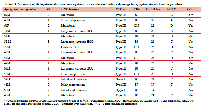 The aim of this study is to describe and analyse the presentation, management and outcomes of HCC patients with jaundice referred to a large academic centre in South Africa.