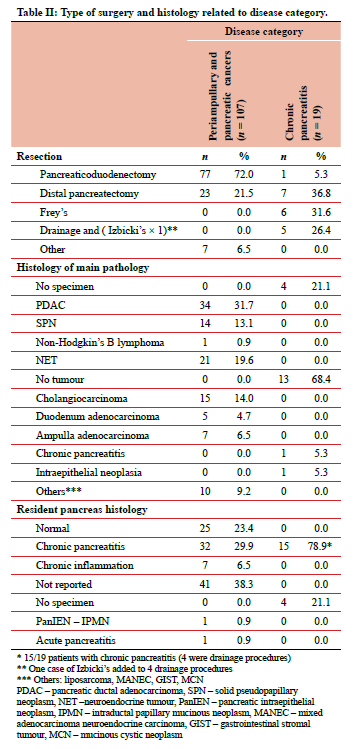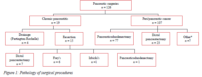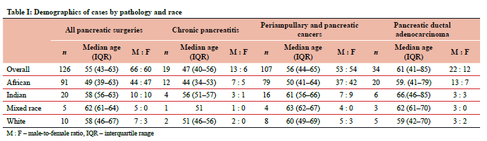 METHODOLOGY: A retrospective audit of patients undergoing pancreatic surgery at Inkosi Albert Luthuli Central Hospital (IALCH) between 2003 and 2023 was conducted. The patient demographics, human immunodeficiency virus (HIV) status, histological subtypes, type and extent of surgery, and 30-day and overall mortality were captured from medical records. The presence of CP in the resident pancreas of patients resected for pancreatic and PAC was obtained from the pathology reports.