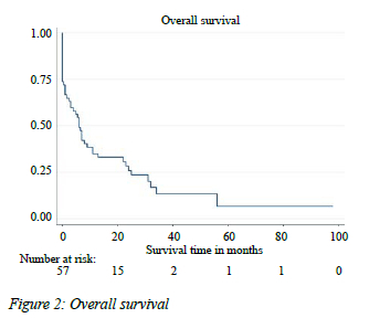 There were 57/61 patients with PAC who underwent PD whose life status could be ascertained, which represents an attrition rate of 6.6%. Of the patients, 46 (80.7%) had died, and the remaining 11 were still alive at the time of analysis and thus considered censored. The overall median time to mortality from surgical intervention was six months (95% CI IQR 4.15-7.85 months) and seven months (95% CI IQR 1.5-26 months) from presumptive diagnosis. The OS curve of the 57 patients is shown in Figure 2.