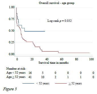 Factors associated with time to mortality were analysed in the subgroups of patients using KM survival analysis and Cox proportional hazard models. For KM analysis, age was subdivided into two groups based on receiver operating characteristic curve (ROC) classification of optimum differentiation between alive and dead patients at 52 years. There was a statistically significant difference in survival between those > 52 years (see Figure 3) and those below that age (p = 0.032). While HIV status and cancer cell line lineage (see Figure 4) show trends in association with time to mortality, only age remained a significant predictor after adjusting for confounders.