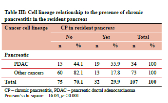 The overall prevalence of CP in the resident pancreas of patients undergoing pancreatic surgery for cancer was 29.9%, and a further 6.5% with chronic inflammation not meeting the threshold for CP diagnostic criteria. We found a significant association between the type of cell line and the presence of CP, with CP being more common within the resident pancreas from PDAC resections (55.9%) versus other cancers (17.8%) (p < 0.001) (Table III).