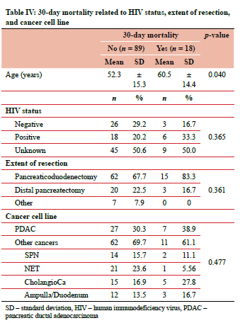 Only age was significantly associated with 30-day mortality (p = 0.040), with those who died being slightly older than those who did not die (odds ratio [OR] = 1.039 [95% CI 1.001-1.079]). Other variables (HIV status, presence of CP in the resident pancreas, pancreatic cell line, and extent of surgery) tested showed similar rates between those who died and those who did not die (Table IV).