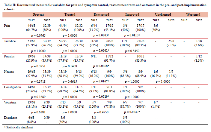 Documented measurables for pain and symptom control, reassessment rates and outcomes in the pre- and post-implementation cohorts are shown in Table II. Pain (n = 44 in 2017 and n = 32 in 2022) and obstructive jaundice (n = 53 in 2017 and n = 30 in 2022) were the most frequently recorded symptoms in both cohorts. Of the patients, 50 (94.3%) in 2017 and 28 (93.3%) in 2022 required endoscopic biliary drainage to alleviate obstructive jaundice. Reassessment rates of patients with documented symptoms improved for all symptoms in the post-implementation cohort. High improvement rates of all symptoms were present in both groups.