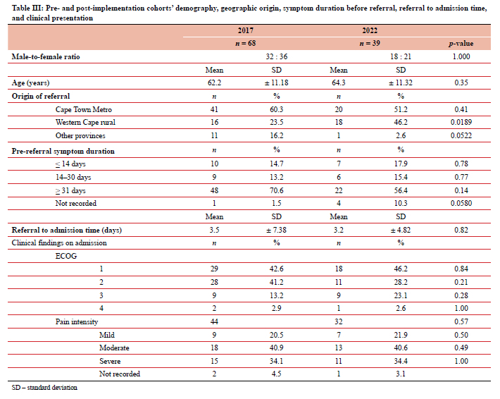 In total, 68 and 39 patients were included in the pre- and post-PC-QI groups, respectively. There were no differences in the demography, duration of symptoms before referral, and time from referral to admission for the two patient cohorts (Table III). More referrals were from rural Western Cape in the post-PC-QI group (p = 0.0189). Clinical parameters on admission were similar in the two cohorts.
