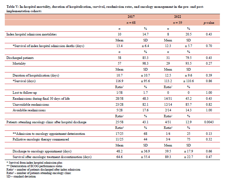 The significant decrease in the proportion of patients who attended the oncology clinic was likely the result of more appropriate referrals due to shared decision-making in the MDT meetings where oncologists and PC specialists were present. The high number of patients who die in the hospital during the index admission in both cohorts is concerning. It is well recognised that, in general, patients prefer to die at home, and in-hospital deaths are considered poor outcomes.23 Gomes et al.23 reported that in countries where integrated PC is lacking, more cancer deaths occur in hospitals. Patients discharged from the hospital had a similar mean survival (116.9 days in 2017 and 113.2 days in 2022). This contradicts a recent Finnish study where the OS significantly improved after PC intervention.24