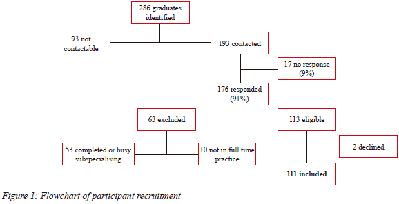 Of 286 general surgeons who had passed the fellowship of the College of Surgeons final examination between 20172022, 193 were contactable and were invited to participate (contact rate 67%). Of the 176 who responded (91% response rate of those who could be contacted), 63 were excluded as they were either in the process or had completed a sub-specialty or were not in full time practice. Of the 113 who were eligible, 111 agreed to participate and were included in the study (Figure 1).