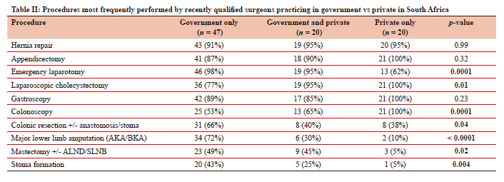 Looking only at the cohort of surgeons currently working in SA, the most frequently performed procedures according to practice (government vs private), are shown in Table II. The differences between government, combination of government and private practice, and private practice only were analysed statistically.
