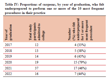 In terms of year of graduation, preparedness to independently perform one or more of the 10 most frequently performed procedures in practice is shown in Table IV. Although the numbers were too small to allow for statistical comparison, the impact of the COVID-19 pandemic in 2020 is clearly seen.