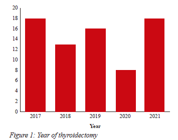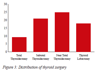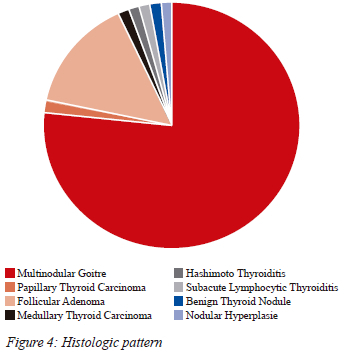 Figure 4 highlights the histology profile of the resected thyroid glands. The majority were multinodular goitres, 56 (77.0%). There were two cases of occult malignancy -papillary thyroid carcinoma (1%) and medullary thyroid carcinoma (1%).