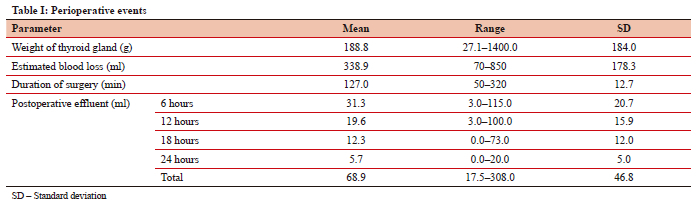 The results regarding the duration of surgery, weight of the thyroid gland, intraoperative blood loss, and volume of drain effluent measured every 6 hours are summarised in Table I. The duration of surgery ranged from 50-320 minutes (mean 127 minutes), with an average blood loss of 338.9 millilitres. Three patients (4.1%) had intraoperative blood transfusions due to blood loss exceeding 500 ml.