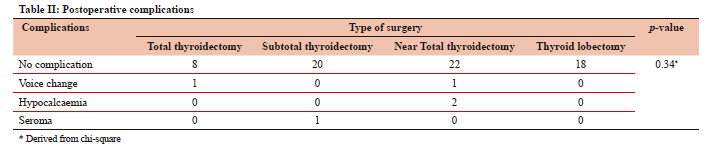 Sixty-eight (93.2%) patients had no complications (Table II). Of the five (6.8%) patients with complications, two (2.7%) had asymptomatic hypocalcaemia and were placed on oral calcium supplementation. Hypocalcaemia was defined as a postoperative calcium level below 8.0 mg/dL (2.00 mmol/L) - reference range 8.0-10.5 mg/dL or 2.00-2.60 mmol/L. One (1.4%) patient had a seroma which was aspirated in the clinic and two (2.7%) had transient reduced voice quality, which had normalised at three-month follow-up. We found no significant difference in the complication rate between the different types of operations (p = 0.34), although we did not record any complication in the patients who had lobectomy.