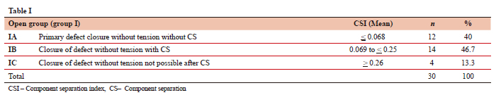 In group I, hernia repair was performed by open approach. Operative assessment for complete closure of defect was done. If complete closure of defect was not possible, CS was done using the transverses abdominis release technique. Normal microporous polypropylene mesh was placed in all cases in the preperitoneal space. The value of CSI based on the preoperative MDCT was noted in patients in whom primary complete closure of defect was not possible and CS was required.