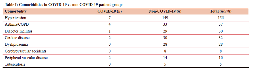 Thirty-two patients (5.5%) did not require any ventilatory support, while 167 (28.9%) required supplemental oxygen via facemask, 358 (61.9%) required endotracheal intubation and 21 (3.6%) required a tracheostomy. There were no significant associations between any demographic factors or comorbidities and the extent of ventilatory support needed. There were no significant associations between COVID-19 infection and the extent of ventilatory support needed (p = 0.13) (Table II).