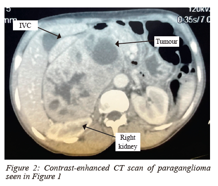 The patient with triple tumours fared better than the one who had one paraganglioma complicated with catecholamine crisis that resulted in bilateral gangrene of lower limb.