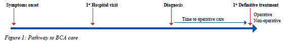 There are sentinel stages along the BCA pathway to care, including the first symptom, first healthcare visit, diagnosis and first definitive (operative or non-operative) treatment, and the time between these can be measured (Figure 1). Various factors can contribute to delays in getting the first definitive care, and these factors could range from patient factors such as lack of health education and transportation challenges to fear of the healthcare system and use of alternative care providers. Healthcare system-related factors, such as lack of diagnostic or treatment resources or shortage of operating facilities, may also delay receiving definitive care.5,6