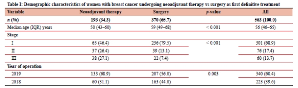 There were 794 women with BCA during the study period. Of these, 563 (70.9%) had a biopsy and an operation. Three hundred and seventy (65.7%) had surgery as their first definitive treatment, and l93 (34.3%) had NAC as their first definitive treatment. The median age of those who had surgery first was 59 (interquartile range [IQR] 49-68) years compared to 50 (IQR 43-60) years (p < 0.001) for those who had NAC first. Those who had surgery first were more likely to be stage 1 (79.5%) compared to those who had NAC (46.4%, p = 0.003) (Table I). BCA surgery volume increased over the study period.