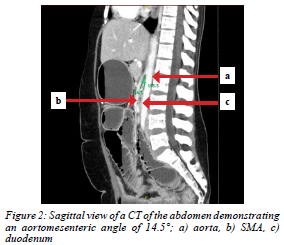 Failure of resolution of the adhesive bowel obstruction to conservative measures prompted further investigations. The patient could not tolerate gastrografin and therefore a contrasted abdominal computerised tomography (CT) scan was performed which showed duodenum interposed between the abdominal aorta and superior mesenteric artery (SMA) (Figure 1). The aortomesenteric angle (AOM) was 14.5° suggesting SMA syndrome (Figure 2). Additionally, there was adhesive small bowel obstruction with a point of obstruction in the proximal ileum (Figure 3).