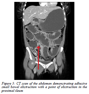 The patient presented 2 weeks later with features of adhesive bowel obstruction. She had reported bile-stained vomitus and obstipation. Incidentally, the patient also reported intermittent bilious vomiting persisting for over 10 years, accompanied by a gradual, progressive loss of weight. These symptoms began following a caesarean section for the birth of her first child. Notably, no endoscopic evaluations had been performed at the time. Clinically, the patient was dehydrated, and tachycardic but normotensive. The abdomen was distended but soft and non-tender. There were no systemic signs of sepsis. An abdominal X-ray demonstrated a mid- small bowel obstruction.