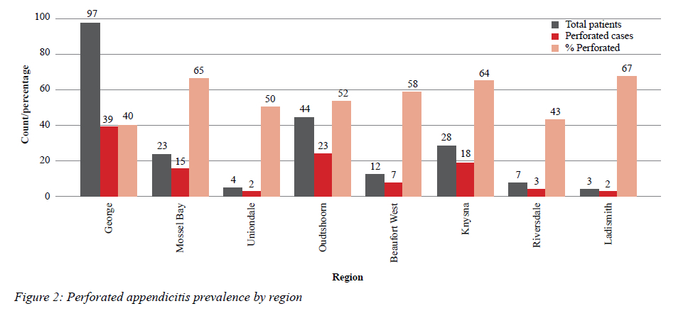 Most of the patients originated from surrounding districts, with Oudtshoorn (44/218; 20.2%) and Knysna (28/218; 12.8%) representing the highest regional contributions (Figure 2). There was a statistically significant difference in the prevalence of perforated appendicitis between George (40.2%) and other regions combined (57.9%) (p-value 0.014).