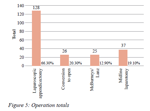 Ofthe patients who had surgery (193/218), most underwent laparoscopic appendicectomy: 128/193 (66.3%), with a conversion rate to open appendicectomy in 26/128 (20.3%). Open appendicectomy was performed in 62/193 (32.1%), of which 37/62 (59.6%) required midline laparotomy (Figure 5).