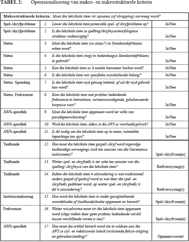 In TABEL 2 word die opname- en elimineringskriteria prakties opgesom en geoperasionaliseer in ʼn aantal vrae. Hoe meer ja-antwoorde op die makrostrukturele vrae verkry word vir ʼn voorgestelde leksikale item, hoe groter sou die kans wees dat die leksikale item in die AWS opgeneem kan word. Die antwoorde op die mikrostrukturele vrae verskaf leiding oor hoe die inskrywing uiteindelik in die AWS daar sal uitsien. Soos telkens hier bo geargumenteer is, moet geen van die kriteria egter verabsoluteer word nie - ʼn holistiese beskouing en benadering is van kardinale belang, soos geïllustreer word in Van Huyssteen (2017).