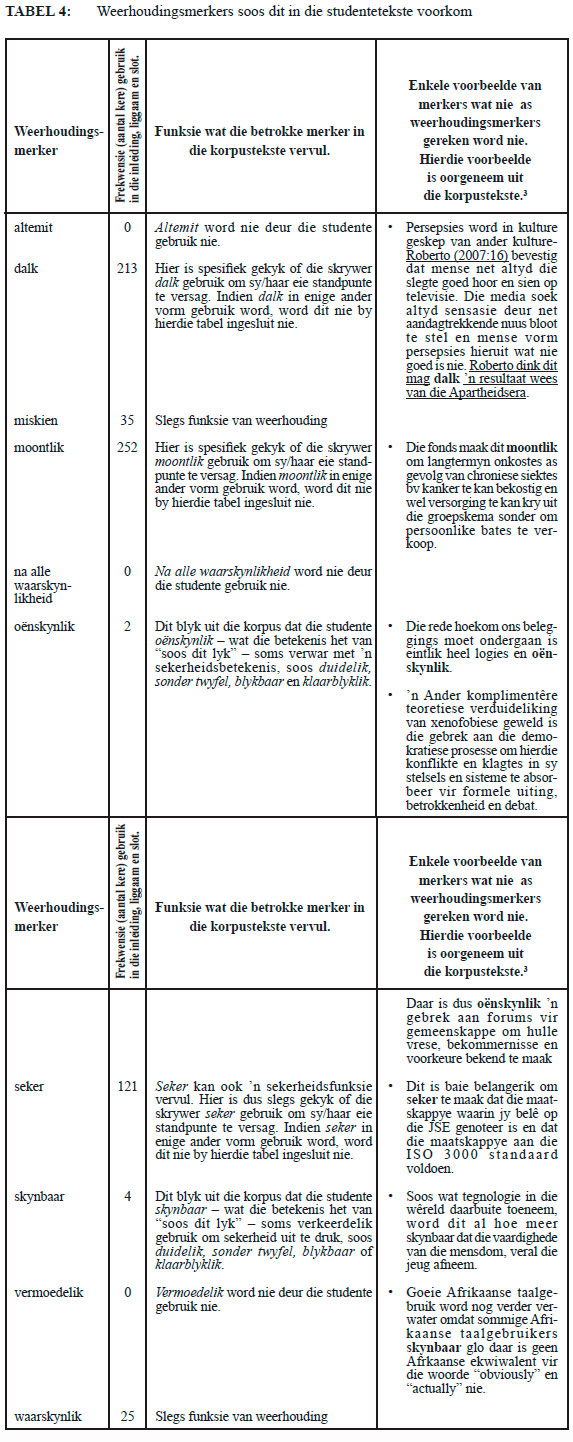 Weerhouding is min in die inleidings gebruik (slegs 21 trefgevalle in die 731 studentetek-ste), veral as daar in ag geneem word dat die tesisstelling wat hier verskaf word, nog nie beredeneer en aan die hand van voldoende bewyse ondersteun is nie. Derhalwe kan dit nie reeds in hierdie gedeelte van die teks as 'n voldonge feit deurgegee word nie (Meintjes, 2015:251).