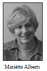 Mariëtta Alberts started her career as terminologist in 1971 at the Language Services Bureau in the then Department of National Education. She served as secretary of the Coordinating Terminology Board (COTERM) and as a member of LANGTAG (Language Task Group). In 1982 she accepted a position at the Human Sciences Research Council as chief researcher of lexicography, terminology, and computational linguistics. In 1995 she returned to the National Terminology Service and was instrumental in drafting the draft Bill dealing with the establishment of the national lexicography units. For almost two years in 2000 and 2001, she acted as manager of the terminology office, and in 2001 she was appointed manager at the Pan South African Language Board of the newly established National Lexicography Units. She conducted training in terminology principles and practice at various tertiary and government institutions. Upon retirement from PanSALB, she was the Director: Terminology and Standardisation. She is a founder member of Afrilex and served on its Board. She also served on ISO/TC 37 and SABS/ TC 37 and was Vice-President of Infoterm. She received honorary membership of Infoterm, Afrilex and Prolingua. During her career she was the recipient of the CJ Langenhoven Award (2003), an ATKV Wordwise trophy (2006) and the CL Engelbrecht Award (2009) as a member of the Taalkommissie (language commission). As a member of terminology teams, she received the Stals Award (2011), ATKV Wordwise trophies (2008, 2017, 2019, 2020) and the Dictionary Award of the South Africa Translators' Institute (2017). In 2024 she received the SAAWK Medal of Honour for Human Sciences. She is the author of two books on terminology and terminography (2017, 2019).