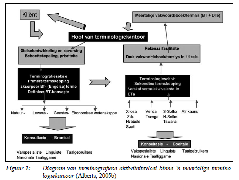Die staat het in 1928 'n Vertaalburo in die Departement van Onderwys, Kuns en Wetenskap gestig. Daar is toe ook by die destydse Suid-Afrikaanse Spoorweë en Hawens (later SA Vervoerdienste) en die Suid-Afrikaanse Weermag (Vloot, Lugmag en Leër) taaldienste tot stand gebring. Die staatsamptenare verbonde aan die Staatsdiens se taalkantore was meesal Afrikaanssprekend, maar moes dokumente in Engels en Afrikaans lewer. Vertalers verbonde aan instellings in die openbare sektor het spoedig besef dat die tweetalige terminologie waarmee hulle daagliks werk, aangeteken en gestandaardiseer moet word om eksakte kommunikasie te bevorder, want 'n proliferasie van terme vir dieselfde konsep het tot wankommunikasie gelei. Die vertalers het gevolglik begin om termlyste vir eie gebruik saam te stel. Nog later het taalkantore termlyste vir hul onderskeie beroepsfere begin saamstel om te verseker dat terme konsekwent gebruik en gestandaardiseer word. Die tweetalige termlyste wat deur verskeie instansies saamgestel is, het 'n stewige terminologiese basis in Suid-Afrika help vestig (Botha, Alberts & Kapp, 2010; Alberts, 2015b). Die proses waarin vertalers terminologie aanteken, staan bekend as die vertaalgeoriënteerde terminografiebenadering (Engels: translation-oriented terminography (TOT)) (vgl. ISO, 2000; Alberts, 2017:177-179).