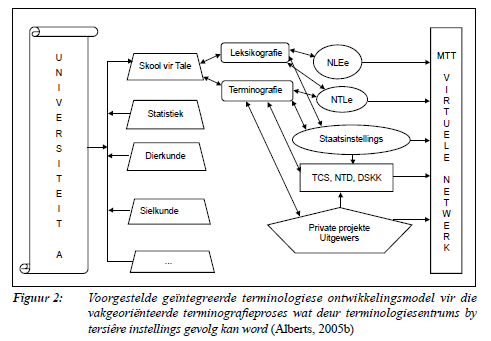Hierdie instellings het almal die een of ander taaldiens gehad en taalpraktisyns het termlyste en vakwoordeboeke saamgestel. Die terminologie van die bepaalde instelling is in die meeste gevalle deur die instelling self aangeteken en dan as vakwoordeboeke of termlyste gepubliseer (Alberts, 2003:136; 2015b). Dit is egter uit genoemde vakgebiede baie duidelik dat daar geen terminologiekoördinering was nie en elke instelling het na goeddunke terminologie geskep en versprei.