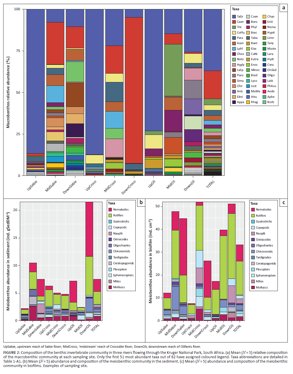 Macrobenthos was at least three orders of magnitude less abundant than the meiobenthos: on average, 130 macrobenthic individuals per m2 against 332 000 ind. m−2 for biofilm-dwelling meiobenthos (Table 2). Macrobenthos abundance appeared significantly lower in the Sabie River (ANOVA, F2,36 = 8.4, p < 0.001). The macrobenthic community consisted of 82 taxa from 53 families or coarser taxonomic groups. Fifty-seven taxa could be further resolved to genus or species level (Table 1-A1). The taxon dominating the macrobenthic community was Tarebia granifera, making up 36.95% of the macrobenthic community on average. However, T. granifera made up 73% - 87% of individuals in upstream reaches (Figure 2a). As a result, reach position had a significant effect on the relative abundance of T. granifera (ANOVA, F2,36 = 101, p < 0.001). The larval stage of the ephemeropteran genus Caenis sp. was the second most common macrobenthic taxon, representing 16.8% of the assemblage on average and being especially abundant in mid- and downstream reaches of the Sabie and Crocodile rivers (Figure 2a, Table 1-A1). Other macrobenthic taxa collectively represented 46.2% of the assemblage on average (Figure 2a), with only 14 taxa making up individually more than 1% of the assemblage (Tricorythus sp., Corbicula fluminalis, Paragomphus sp., Acanthiops sp., Leptophlebiidae, Cheumatopsyche sp., Notogomphus sp., Hydroglyphus sp., Laccocoris sp., Pseudagrion sp., Simulium sp., Chironominae Anisops sp., Elminae larvae; see Table 1-A1). On average, 9.2 different macrobenthic taxa were identified from each sample (Table 2); however, taxon richness was significantly lower in upstream reaches in comparison to mid- or downstream reaches (Table 2, ANOVA, F2,36 = 12.7, p < 0.001). Shannon's diversity index (H') was also lower in upstream reaches (Table 2) but was further found to be significantly lower in the Crocodile River as well (ANOVA, F2,36 = 11, p < 0.001). Pielou's equitability index followed a similar pattern as H' with communities generally more equitable in mid- and downstream reaches (ANOVA, F2,36 > 11.2, p < 0.001), except for the downstream reach of the Crocodile River, which was uneven and strongly dominated (87%) by Caenis sp. (Table 2, Figure 2a).