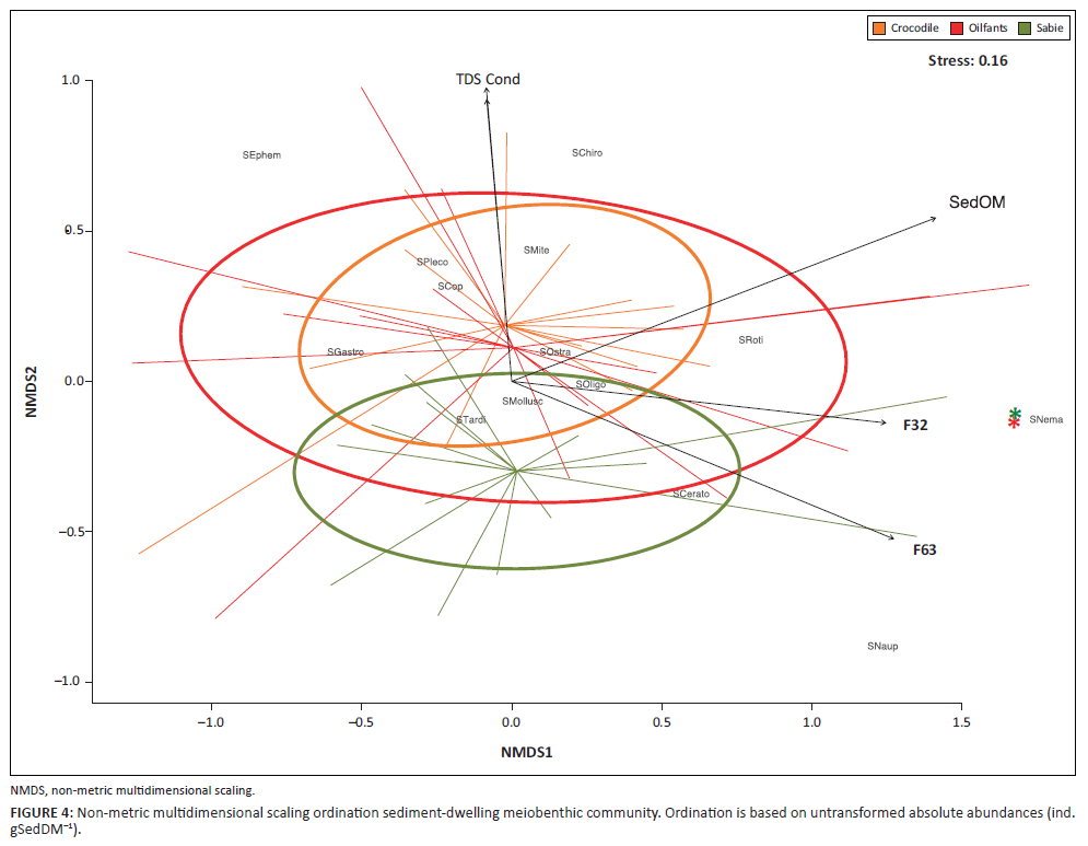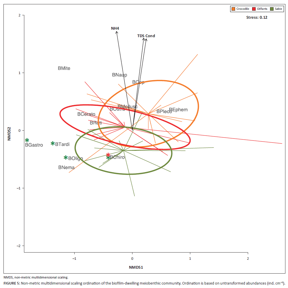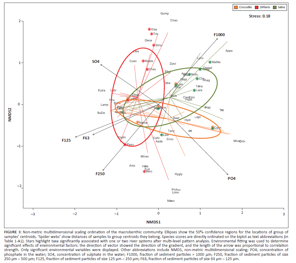 The multi-level pattern analysis identified 14 taxa significantly associated with one river group. Those groups are highlighted with stars on the NMDS biplot (Figure 3). Namely, only macrobenthic nematodes were found to be significantly associated with the Crocodile River. The ephemeropteran larvae Tricorythus sp. and Elassoneuria sp., the trichopteran larvae Cheumatopsyche sp. and Macrostemum sp., the dipteran larvae of Simulium sp., the dragonfly larvae of Pseudagrion sp. and coleopteran adults of Berosus sp. were significantly associated with the Olifants River. The ephemeropteran larvae of Machadorythus maculatus, the hemipteran Laccocoris sp., the dipteran larvae of subfamily Chironominae, the dragonfly larvae of Lestinogomphus sp. and Notogomphus sp., and the coleopteran larvae of subfamily Larainae were significantly associated with the Sabie River. The clam Corbicula fluminalis was associated with both Crocodile and Olifants rivers. Dragonfly larvae Coenagrionidae and Paragomphus sp., and ephemeropteran larvae of the Leptophlebiidae family were associated with both Crocodile and Sabie rivers (Figure 3).