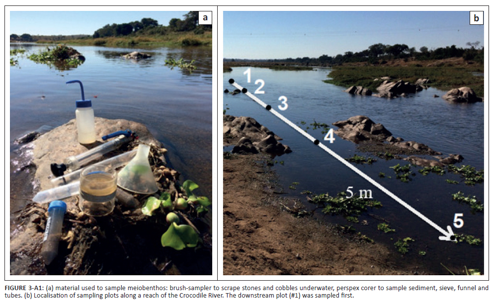 At each plot, 500 mL of water was collected for nutrient analyses; and water temperature, pH, conductivity, dissolved inorganic salts, total dissolved solids and turbidity were measured in situ with a portable probe (HI9813-5, Hanna Instruments Inc., Bedfordview, South Africa). Sediments were sampled to measure total organic carbon by pushing one 2-cm diameter Perspex corer (Figure 1-A1) through 5 cm of the upper sediment layer at one location chosen randomly within each plot. Sediments were sampled for meiobenthos by pushing two 2-cm diameter Perspex corers through 5 cm of the upper sediment layer at two different locations within each plot. The two sediment cores collected were merged in the same tube and the resulting sample was fixed in a final concentration of 4% buffered formaldehyde. A calibrated brush-sampler (Figure 3-A1; Peters et al. 2005) was used for underwater sampling of 3.14 cm2 areas of biofilm (and its associated meiobenthos) growing on hard substrates such as rocks and cobbles. This process was repeated three times at different random locations within each plot, using a 20-µm-aperture nylon mesh sieve each time to concentrate the collected subsamples. The contents of the sieve were then poured into a tube and the resulting total sample (representing an area of 9.42 cm2) was fixed in 4% buffered formaldehyde.