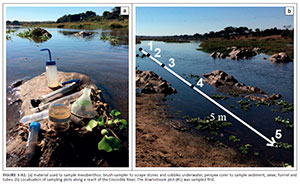 Three sites were selected in each river system, with the help of South African National Park officials and KNP game rangers. Each site was chosen according to its accessibility, the availability of riverine microhabitats (hard and soft substrates) and its coherence regarding our aim to examine the effects of an environmental gradient through the park. As far as possible, we selected river reaches that showed the most similar hydro-morphologies and without riparian canopy cover (e.g. Figure 2-A1). Upstream sites were located close (< 500 m) to the park's border, and to ensure substantial spatial coverage, each sampling site was located 10 km - 60 km apart from each other (Figure 1).