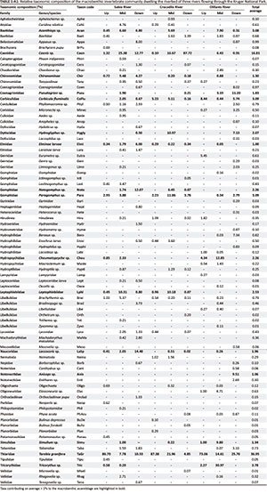 The specific objective of this study is to provide fresh insights into the diversity and distribution of benthic invertebrates (meio- and macrobenthos) in three large rivers (Olifants, Sabie and Crocodile) flowing through an emblematic protected area of austral Africa, the KNP. We sampled the main benthic habitats in those rivers (i.e. biofilms associated with hard substrates and surface sediment) to examine the structure of resident communities. The three rivers were expected to show a gradient of environmental stress as they enter the park: Olifants and Crocodile rivers experience different types of pressures (mostly related to mining practices for Olifants and to agricultural practices for Crocodile), while Sabie is quite pristine in comparison. Thus, we expected that the structure of benthic invertebrate communities could reflect gradients of pollution experienced by the three rivers. Finally, an upstream-downstream gradient was also expected to be manifest through a beneficial effect of preserved areas of the park on the taxonomic richness of benthic assemblages.