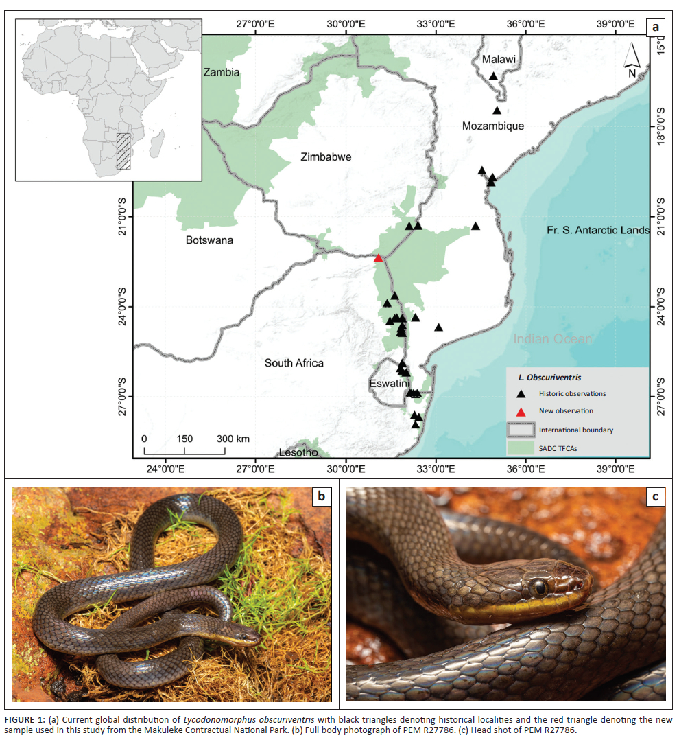 Prior to the discovery of the new records, the known distribution of L. obscuriventris was characterised by two disjunct populations, with a southerly population in eastern South Africa and Eswatini and a northern population in Zimbabwe, Mozambique and Malawi (Broadley, 1983, 1995). This sample, thus fills the gap between the two populations meaning that the distribution is likely continuous. Additionally, the recovery of the snake in the northern Kruger National Park bodes well for the conservation of the species as a large portion of its South African distribution seems to fall within this protected area, although this may be a result of sampling bias. Given the large proportion of records for this species inside the Kruger National Park, future effort should be directed to adjacent areas, including the Great Limpopo Transfrontier Park regions, to elucidate more clearly the ecology, biology and phylogeographic structuring of the enigmatic and elusive water snake.