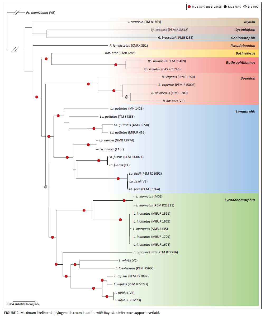 Maximum likelihood (ML) analysis was conducted using IQ-TREE v.2.1.2 (Nguyen et al. 2015). A random starting tree was used, and the ML analysis was assessed using the gene-partitioned scheme mentioned above and 1000 standard nonparametric bootstraps. Bayesian inference (BI) analysis (MrBayes v.3.2.7a; Ronquist et al. 2012) was implemented on the CIPRES Science Gateway XSEDE online resource (http://www.phylo.org; Miller et al. 2010; Tamura et al. 2013) using the best-fit nucleotide substitution models and partition scheme listed above. Two parallel runs of 20 million generations were performed, with trees being sampled every 1000 generations using BEAGLE (high performance likelihood calculation library). Psammophylax rhombeatus was used as an outgroup as only a single sample can be used as an outgroup using MrBayes. The number of generations discarded as burn-in was determined using Tracer v.1.6.0. (Rambaut & Drummond 2007). The effective sample size (ESS) was above 200 for all parameters and the runs reached convergence, indicating that a burn-in of 15% was adequate. Both trees were viewed in FigTree v.1.4.2 (Rambaut 2014).