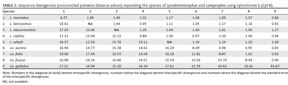 Whilst robust sampling was absent for many of the species in this study (only one sample each for L. obscuriventris, L. whytii and L. laevissimus), both L. rufulus and L. inornatus displayed intraspecific substructuring consistent with geographical variability. Within L. inornatus, the intraspecies diversity was 6.77% for Cyt-b. Whilst higher than the other species of Lycodonomorphus, it must be noted that seven samples (Kelly et al. 2011) were available for this study, five from Haenertsberg and two from the Eastern Cape. The large geographical distance separating the samples may explain the increased intraspecies diversity found with L. inornatus. The addition of new samples, representing the full distribution of the species, would thus likely support the recognition of L. inornatus as a single species, especially because the average interspecific divergence separating species is approximately 16%.