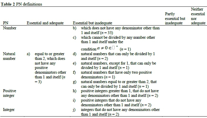 In none of the explanations by PMTs, -1 and the negative counterpart of the numbers were taken as the denominators of the number; all explanations focused on positive integers as denominators. In the definition provided in the Wolfram MathWorld dictionary, the positive denominators were taken into consideration. From this definition, it is understood that a PN has only 1 and itself as the positive denominators, but that it may have negative denominators, and the definition directs us to the statement that a PN is a positive integer greater than 2 with ±1 and ±p as the only denominators (Arıkan & Halıcıoğlu, 2012). When the PMTs used these definitions as reference in the assessment of the explanations, the explanation in (a) by the PMTs were a valid one, and this definition was assessed as essential and adequate. It was found that the explanations other than (a) used the division definition for PNs, and they were assessed in the essential but inadequate category. In (b), all numbers that do not have any denominators other than 1 and itself were acknowledged as PNs. This definition allows negative numbers, zero and even all rational and irrational numbers to be PNs. The majority of the students (n = 33) defined PNs as such. In (d) and (e) the set of natural numbers, with only 1 and themselves as the denominators, was defined as the PNs. While 1 was left out of the set of numbers in (e), it was included in (d). These definitions even allow zero to be a PN. The PNs, which were only positive integers, were expanded to the set of all integers (with 1 and themselves as denominators) in (j). According to this definition, negative numbers with 1 and themselves as the only denominators were acknowledged as PNs. The statement "positive integers, which do not have any denominators other than 1 and themselves" was expressed verbally in (i) and with the
