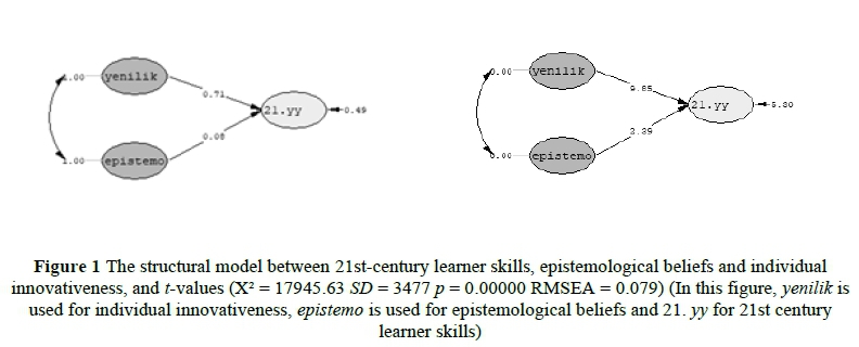In this study, the relationship between 21st-century learner skills, individual innovativeness and epistemological beliefs and the kind of model that exists between these variables were examined. The relational survey, which aims to reveal how variables relate to each other (Gliner, Morgan & Leech, 2015), was used in this study. At the end of the study, the structural model formed by three variables and the relationship between them were shown.