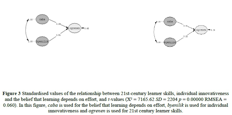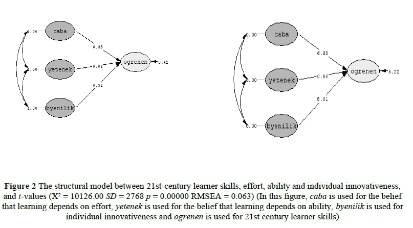 When the fit indices in Figure 2 are examined, it can be stated that, considering the path schema through the structural model, moderate level path coefficients are obtained when predicting the 21st-century learner skills with individual innovativeness and the belief that learning depends on effort. In other words, it can be interpreted that individual innovativeness and the belief that learning depends on effort positively predict 21st-century learner skills. According to these results, individual innovativeness (β = 0.51, p < .01) and the belief that learning depends on effort (β = 0.35, p < .01) directly predicted 21st-century learner skills of teacher candidates but the impacts of the belief that learning depends on ability was nor significant. When the t values for this model are examined, it is clear that the parameter values are significant at the level of 0.01 because they are over 2.56. It can be accepted that the model constructed according to theoretical structure and fit indices is confirmed; however, the t value of ability to learn is not significant.