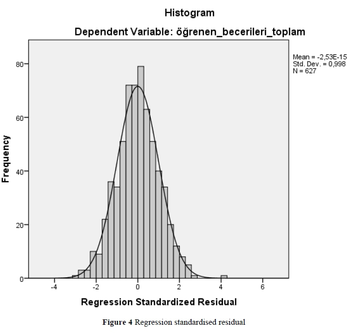 Residual plot analysis was performed to determine whether residual values violate the fit of the model (Kalayci, 2009). It can be stated that if the residual plot values are greater than (- + 3.29), they violate the model and if the value is greater than (- + 2.58) the model does not deteriorate much (§en, 2016). In Figures 4, 5 and 6, residual plot values were found to be within (- + 2.58) limits and did not negatively affect the fit of the model. These results suggest that the multiple regression model supports fitted SEM.