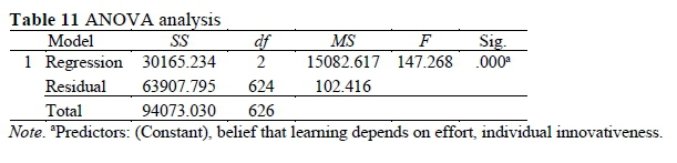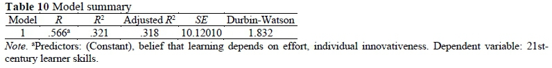 In order to strengthen the fitted SEM model, a multiple regression model of 21st-century learner skills, individual innovativeness and belief that learning depends on effort was made. Firstly, the Durbin Watson analysis, one of the preliminary assumptions of the multiple regression model, was performed. The results of the analysis are shown in Table 10.