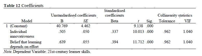 According to the results from Equation 1, it can be expressed that 1 unit increase in individual innovativeness leads to an increase of 0.51 units in 21st-century learner skills, while 1 unit increase in the belief that learning depends on effort, results in an increase of 0.34 units in the 21st-century learner skills.