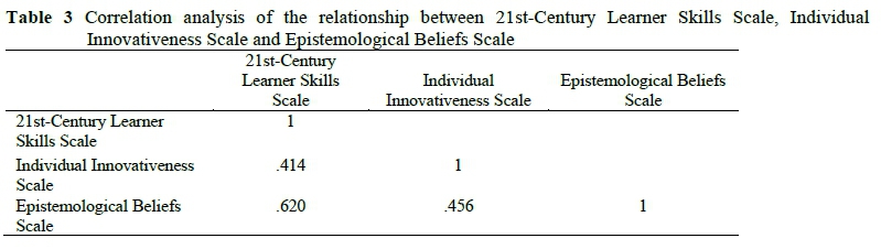 When Table 3 is examined, there is a moderately positive relationship between the 21st-century Learner Skills Scale and Epistemological Beliefs Scale (r = .620, p < .01). Similarly, there is a moderately positive relationship between the 21st-century Learner Skills Scale and the Individual Innovativeness Scale (r = .414; p < .01). There is also a moderately positive relationship between the Individual Innovativeness Scale and the Epistemological Beliefs Scale (r =. 456; p < .01). As can be understood from the results, there is a positive and significant relationship between all three scales.