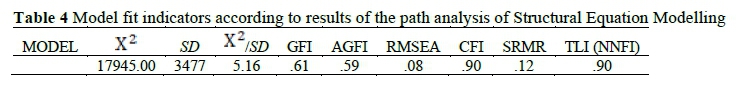 Table 4 covers the standardised values for the model. As seen in Figure 1, X2 = 17945.00 and SD = 3477. When these values were compared to each other, the X2/SD ratio was 5.16. When the model was evaluated according to X2/SD ratio (X2/SD = 17945/3477 = 5.16), the fit can be said to be good. For this model, the RMSEA value was calculated as 0.079 and other fit values as NFI = 0.86, NNFI = 0.90, SRMR = 0.12, CFI = 0.90, GFI = 0.61 and AGFI = 0.59.