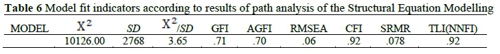 Table 6 includes the standardised values for the model. As seen in Figure 2, X2 = 10126.00 and SD = 2768. When these values were compared, the X2/SD ratio was found as 3.65. When the model is evaluated according to X2/SD ratio (X2/SD = 10126/2768 = 3.65), the fit can be said to be good. For this model, the RMSEA value was calculated as 0.063 and other fit values as NFI = 0.88, NNFI = 0.92, SRMR = 0.078, CFI = 0.92, GFI = 0.71 and AGFI = 0.70.