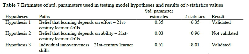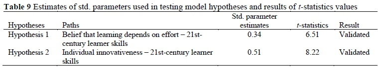 From Table 9 it is clear that the relationship of the 21st-century learner skills with individual innovativeness and the belief that learning depends on the effort is statistically significant, and thus the hypothesis is validated. It is clear from the connections in the model that there is a significant positive relationship between 21st-century learner skills, individual innovativeness and the belief that learning depends on effort. With reference to these values, the regression equation for the model can be as follows: