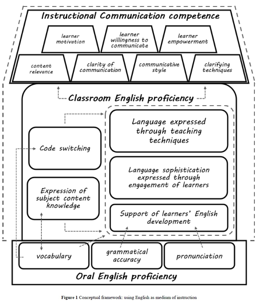 Research that informed the content and structure of our conceptual framework included that on instructional communication (Evans, 2015; McCroskey & Richmond, 1992; Meyers, 2010); teachers' use of language in the classroom (Chadwick, 2012; Erasmus, 2018; Freeman, 2017; Freeman et al., 2015; Loughran, 2010) and language skills required by teachers (Elder, 2001; Loughran, 2010; Pasternak & Bailey, 2004). We synthesised and categorised language skills, structuring them into a hierarchy of three proficiency tiers (Chadwick, 2012; Cummins, 2000; Lucas, Villegas & Freedson-Gonzales, 2008) suggesting that the skills and competencies required for using English as a medium of instruction are: Oral English proficiency which is foundational and equivalent to BICS, Classroom English proficiency which includes the ability to give instructions, praise, reprimand, and pose questions skilfully; as well as the sophisticated linguistic skills required to have mastered Instructional Communication competence - the ability to engage learners actively while expounding the new knowledge/skills competently. Figure 1 visually illustrates our thinking. Arrows indicate which skills directly support others, with the bi-directional arrow linking vocabulary and subject content knowledge indicating their interdependence. Our study focused on oral and Classroom English proficiencies.