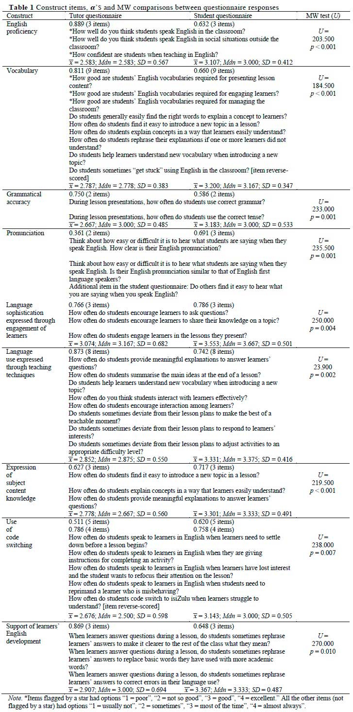 From Table 1 it can be seen that some a's were below 0.6. In such cases, we conducted an item analysis guiding us in deciding on which item(s) to drop. For the construct "use of code switching", the item analysis suggested the removal of one item (How often do students code switch to isiZulu when learners struggle to understand?) which increases the Cronbach's alpha for the tutor questionnaire from 0.511 to 0.786 and for the student questionnaire from 0.620 to 0.758, which are acceptable. The lowest Cronbach's alpha coefficient equals 0.361 for the construct "pronunciation" for the tutor questionnaire. In this case, items could not be removed to increase the Cronbach's alpha values, as this construct consisted of only two items. The unreliability of the two student teacher pronunciation items on the tutor questionnaire -relating respectively to clarity of pronunciation and likeness of pronunciation to that of English first language speakers - may be due to PSTs' varying degrees of accurate pronunciation leading to uncertainty as tutors were expected to provide one answer based on their group of students. Thus, after the removal of one item, all a's were acceptable, except for the construct "pronunciation" (for the tutor questionnaire only). A recommendation for future research is that more items be added to this construct as it is well known that as the number of items of a construct increases, the a will also increase (Field, 2018).
